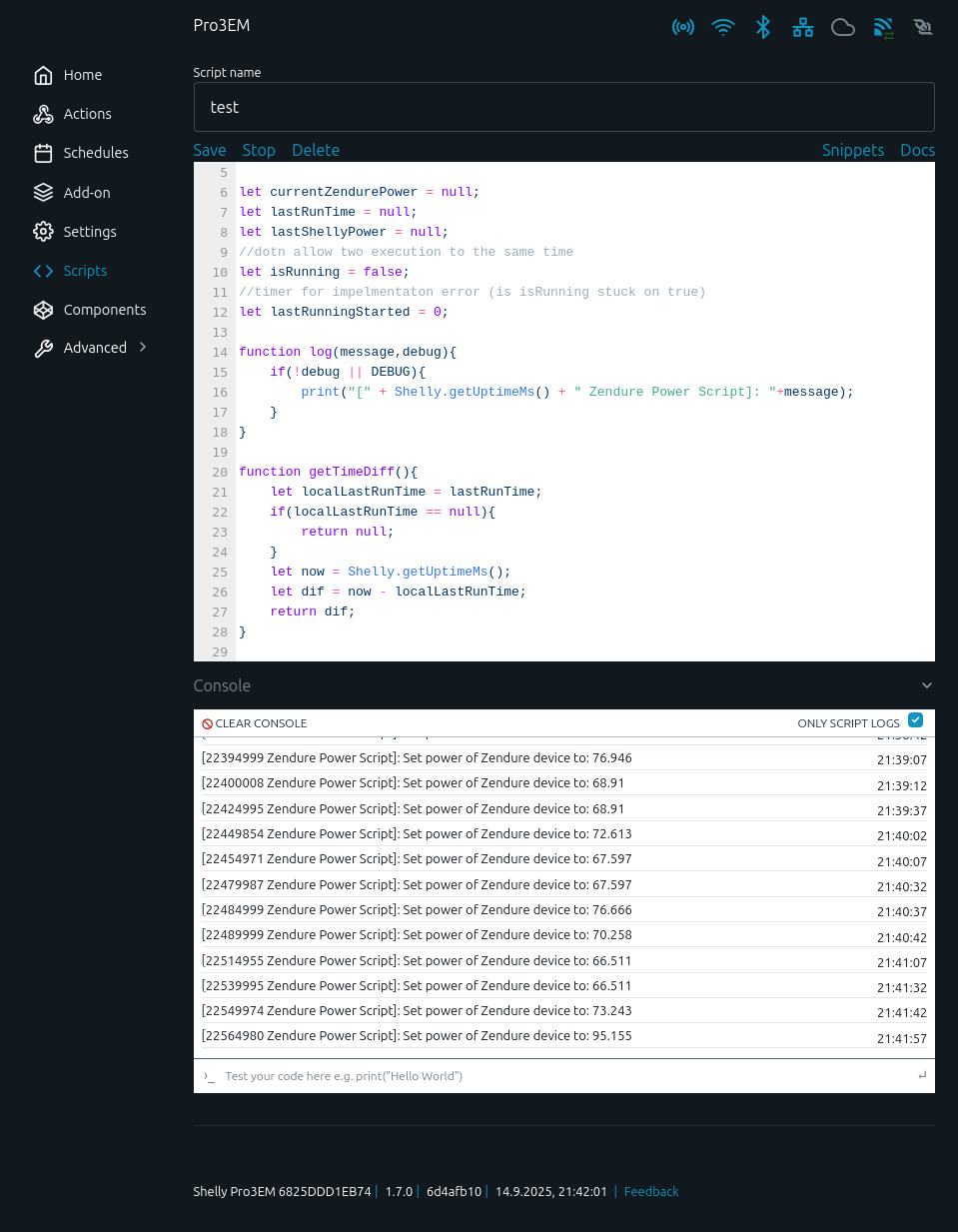 Da es leider nicht (noch nicht) möglich ist den RPC Port des Shelly über die API, also ohne die App und die Kommunikation über die Shelly Cloud, zu setzten müssen wir einen anderen Weg gehen. (Eigentlich war ich hier kurz vor dem Aufgeben, ich hatte beide Geräte lokal miteinander verbunden, aber bekam sich nicht dazu miteinander zu „Reden“). Allerdings bin ich glücklicherweise noch im Shelly auf das Feature Skripte gestoßen!
